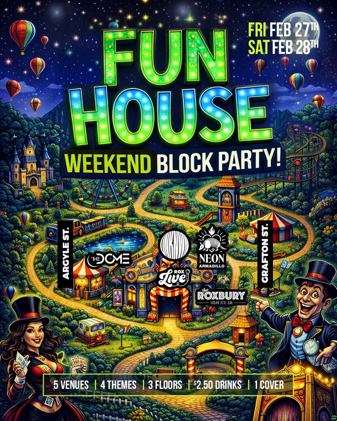 FUN HOUSE WEEKEND BLOCK PARTY is taking over Argyle & Grafton on Friday, Feb 27 & Saturday, Feb 28 — and you’re invited to roam the wildest party playground in the city.