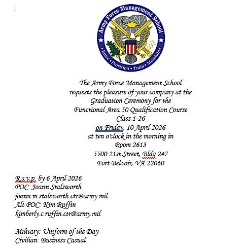 The Army Force Management School requests the pleasure of your company at the Graduation Ceremony for the FA50Q Course Class 1-26
