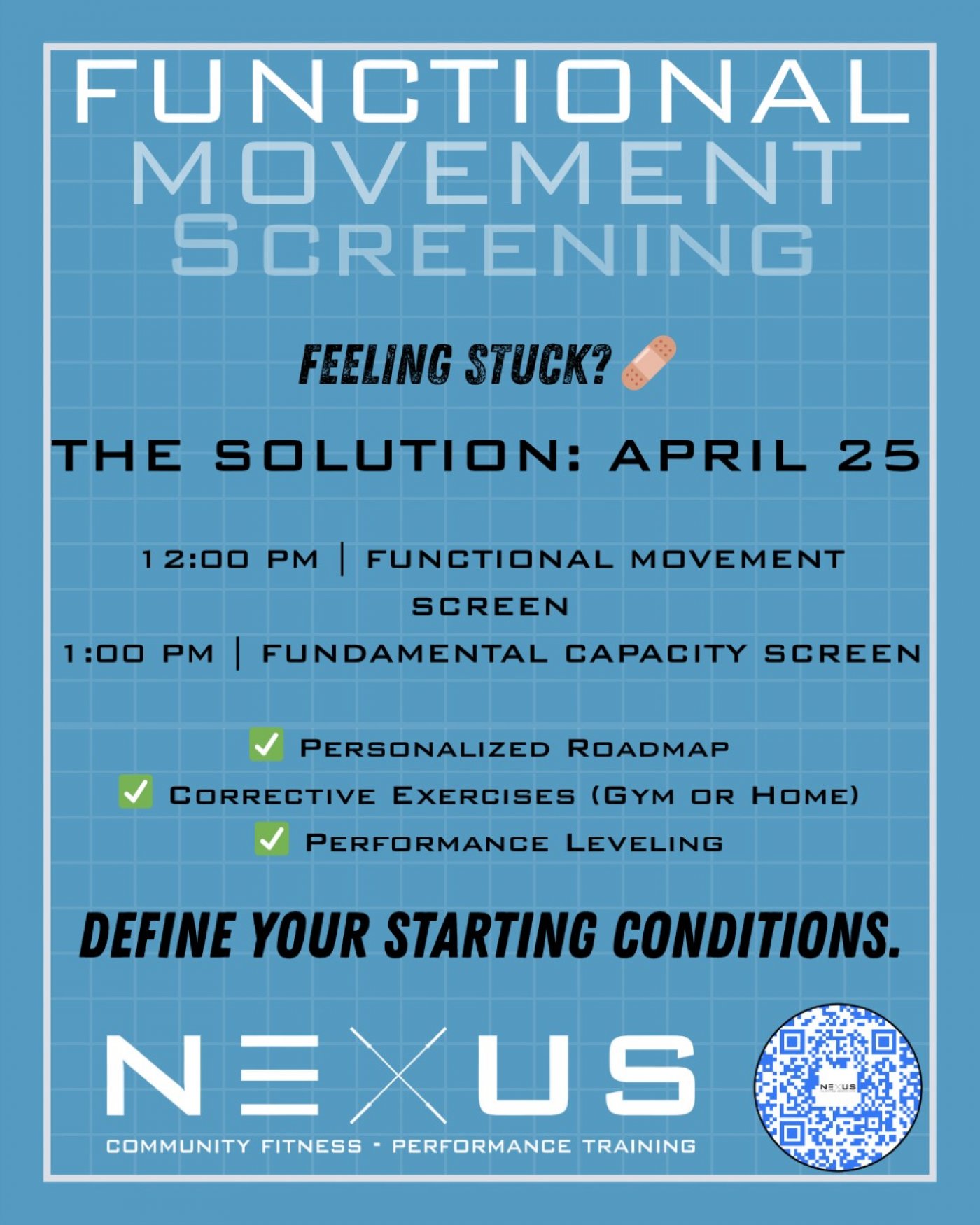 Apr 25th, 12-1pm, is the FMS, the from 1-2pm is the FCS! These are your keys to unlocking hidden habits, building balance, and preventing injuries.