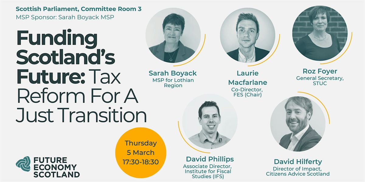 Join Future Economy Scotland (FES) for a timely event, ‘Funding Scotland’s Future: Tax Reform For A Just Transition’. Sponsored by Sarah Boyack MSP, this event will bring together experts and MSPs to examine how Scotland can maximise its fiscal powers in the next Parliament. Informed by FES’s latest research, this event will explore questions such as: