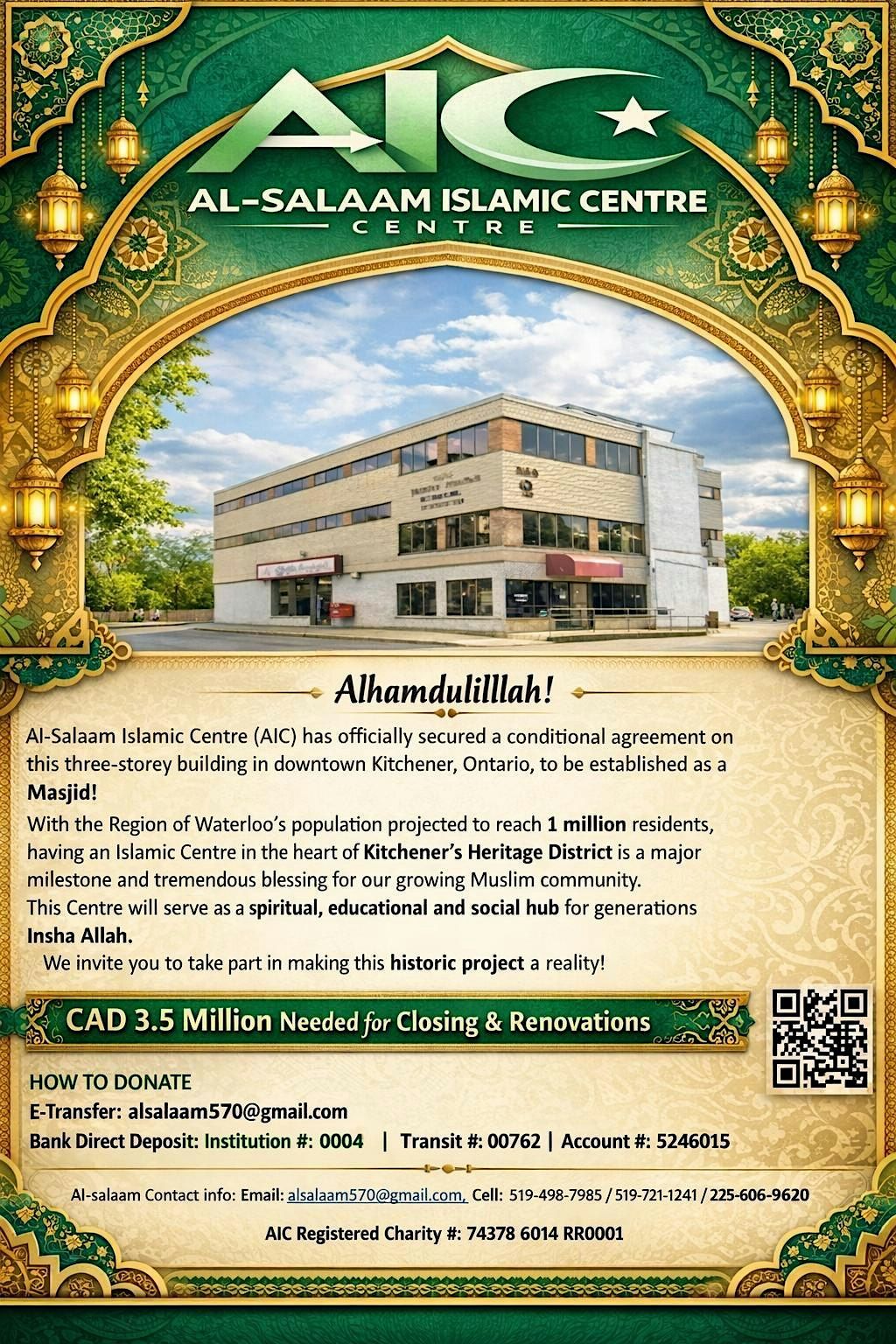 Join us for the Al-Salaam Islamic Centre Fundraising Event 2026, an evening dedicated to helping establish a permanent house of Allah ﷻ in the heart of Kitchener. This community-focused gathering will bring together inspiring speakers, shared reflection, and a clear vision for transforming our newly secured building into a fully functioning Masjid. With refreshments provided, babysitting available, and youth activities in a separate space, this event is designed for the whole family. Your presence and support will play a direct role in turning this historic opportunity into a lasting legacy for generations to come, insha’Allah.