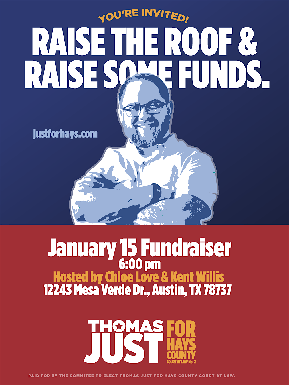 Fundraiser for local attorney Thomas Just for Hays County Court at Law No. 2, hosted by Chloe Love & Kent Willis in South Austin on January 15 at 6 pm.