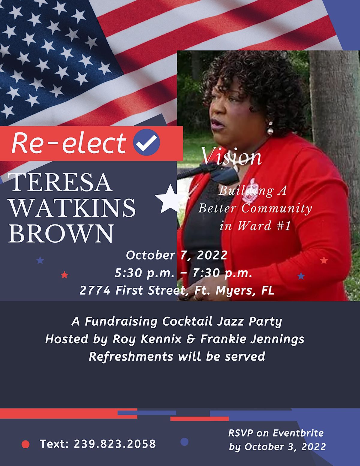 Hosted by Roy Kennix and Frankie Jennings, the public is invited to attend A Fundraising Cocktail Jazz Party to raise money to Re-Elect the wonderful Teresa Watkins Brown. We support Mrs. Watkins Brown because she is, "Building A Better Community in Ward #1."