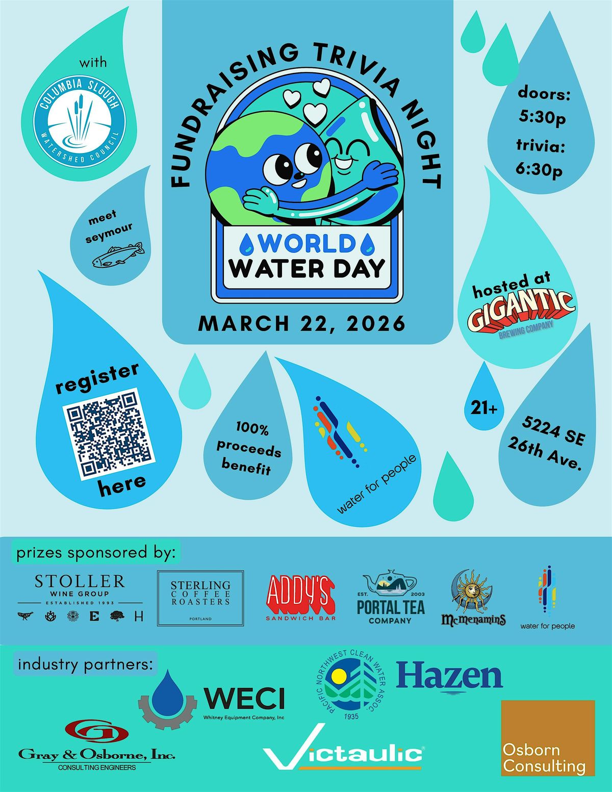 Water For People, the Columbia Slough Watershed Council, and Gigantic Brewing have teamed up to host a fundraising trivia night to celebrate World Water Day! Come test your knowledge, win incredible local prizes, and connect with other people who care about water.