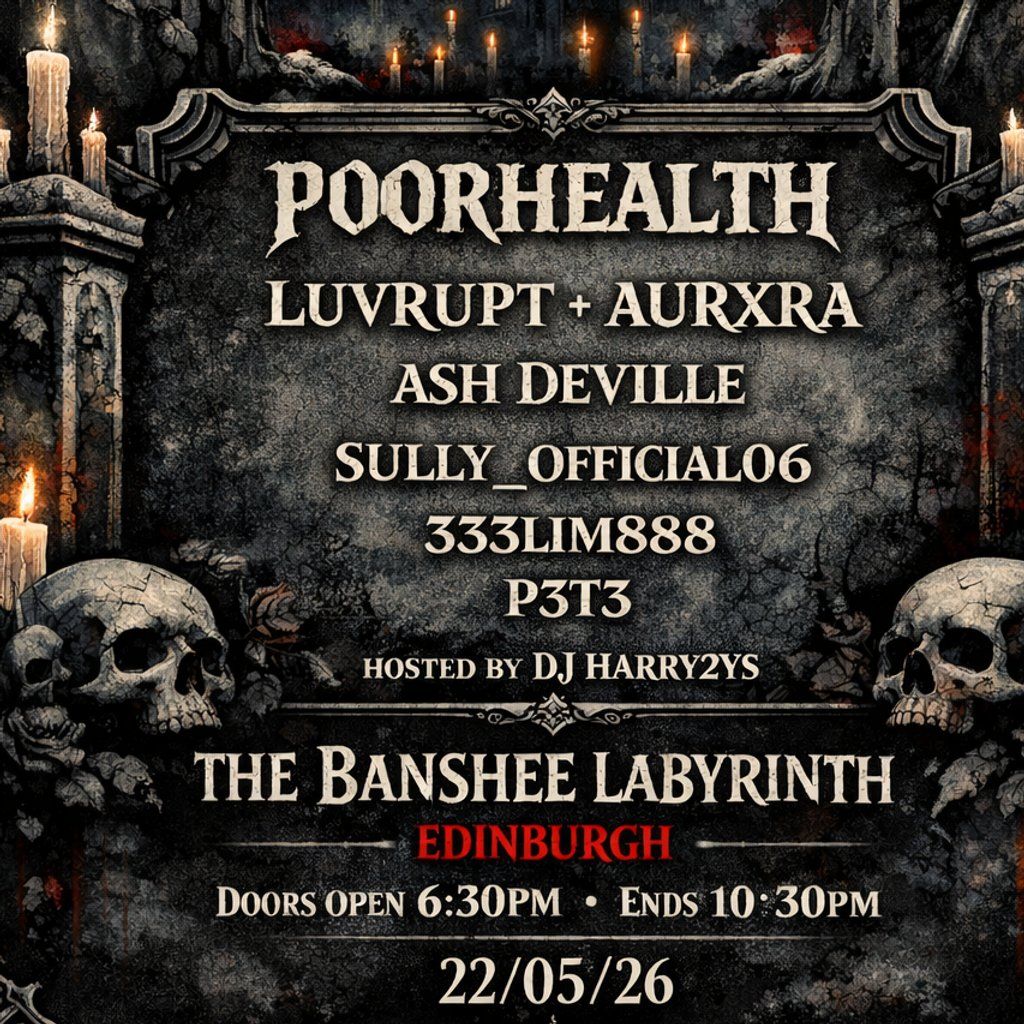 An Alternative Emo Rap / Alt Rock / Dark Trap music event with artists - Poorhealth, Luvrupt, Aurxra, Ash Deville, Sully_official06, 333lim888 & P3T3Music Genres : Rap, Alternative, Emo, Trap, Pop Punk