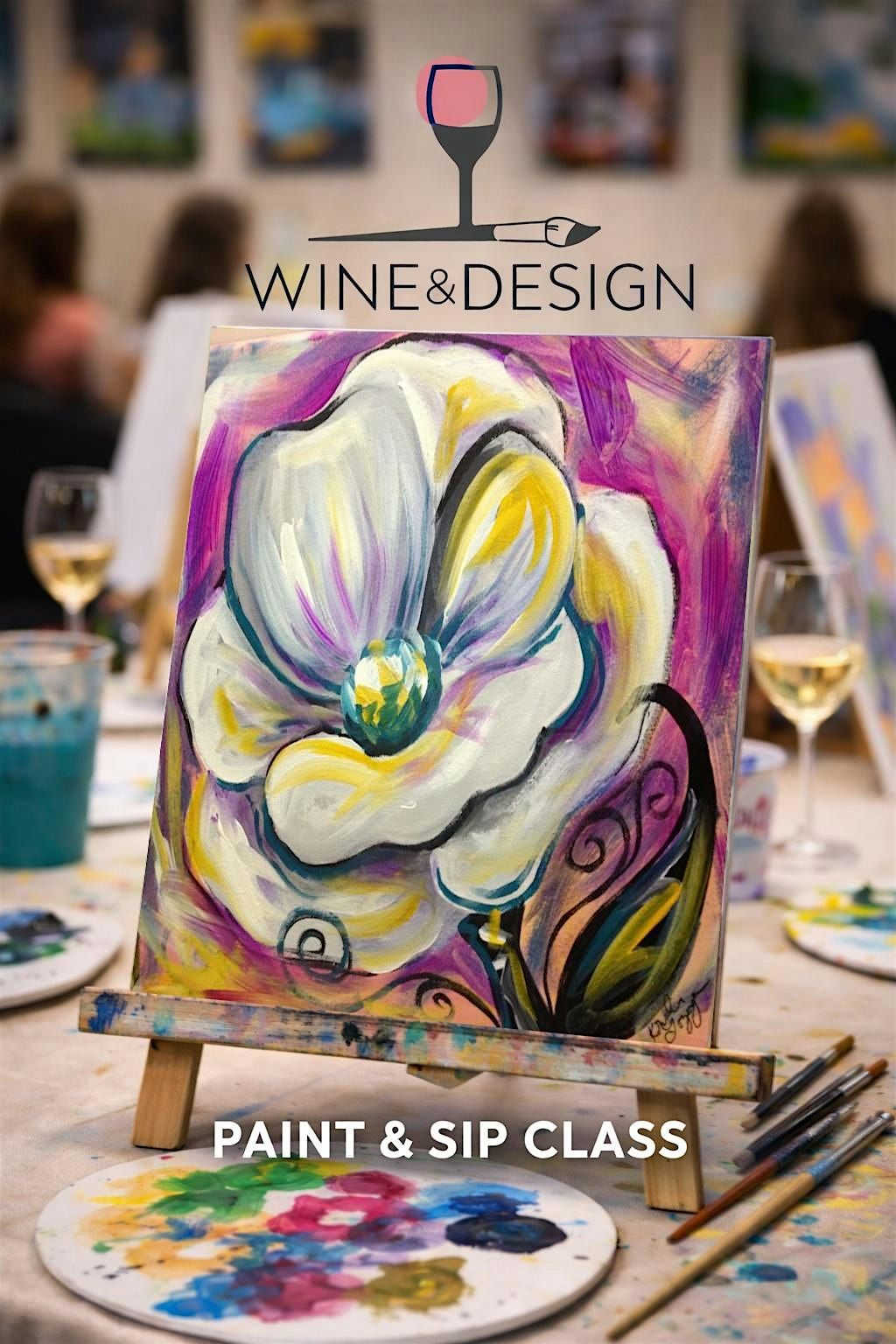 Paint 'Funky Magnolia' at Wine & Design! Guided painting, music & laughs. No experience needed. Bring a guest or come solo to relax!