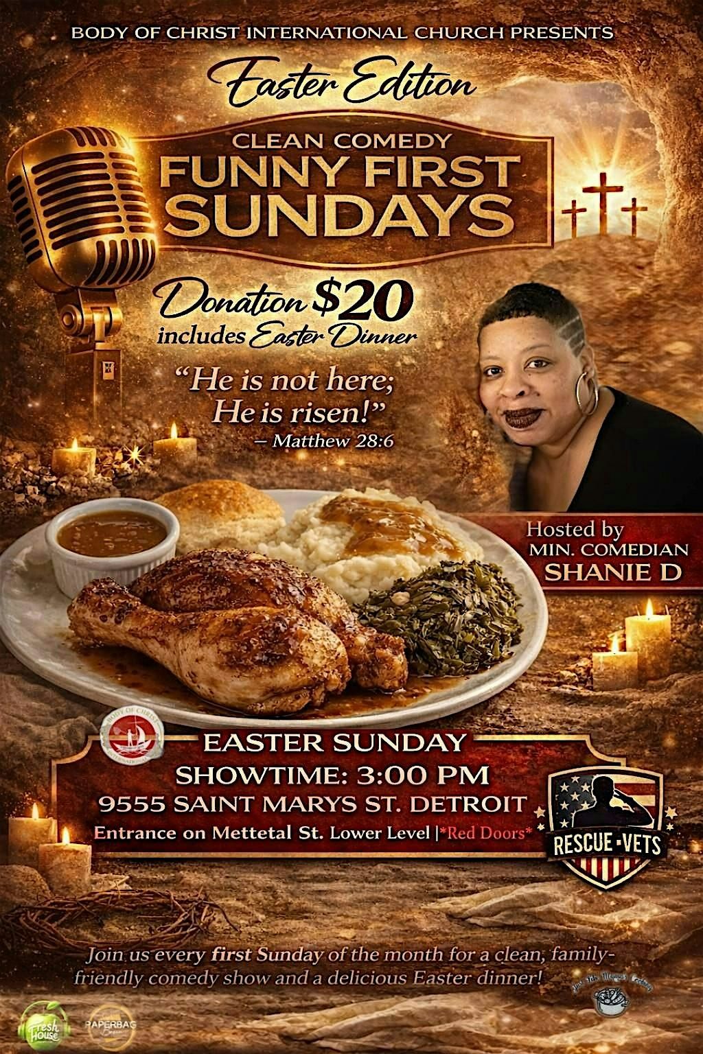 This special event brings together clean, family-friendly comedy, uplifting fellowship, and a delicious Easter dinner — all in one unforgettable experience.
