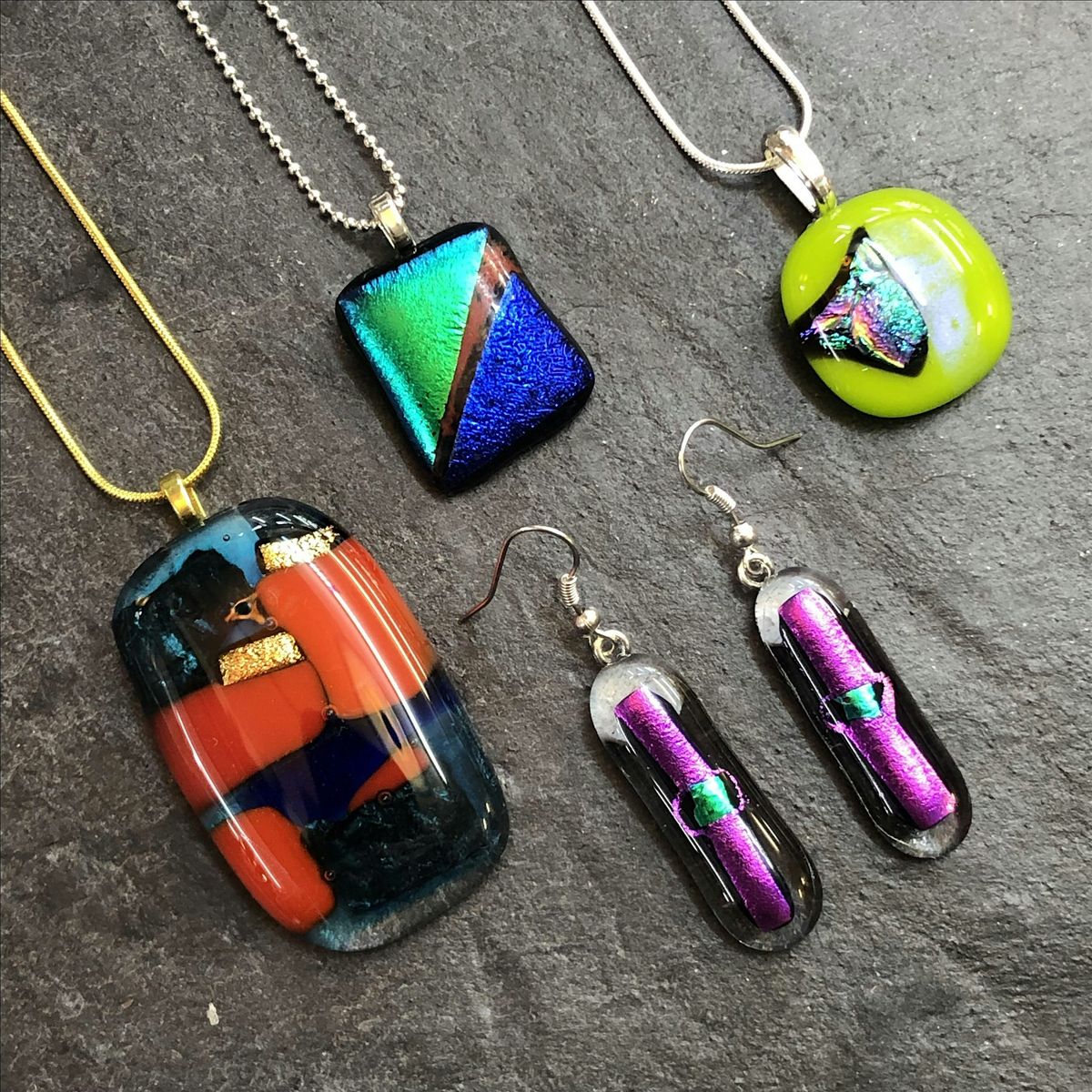 Welcome to our Fused Glass and dichroic jewellery for beginners full day course at Rainbow Glass Studios! Join us at 10.00 until 4.30pm, for a fun and creative workshop. You will learn to cut and combine fused glass to create stunning dichroic jewellery pieces. No prior experience is needed - just bring your creativity and enthusiasm!