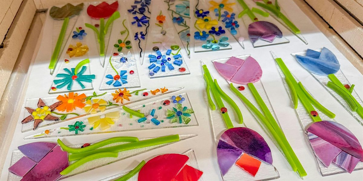 Choose from wildflowers, tulips, daffodils, poppies, and bumble bees. Using simple glass-cutting tools, you’ll shape petals, stems, and leaves, then assemble your pieces onto a precut transparent garden stake. Add a final touch of charm with a ladybug murrini or a mini dragonfly. It’s a fun, relaxed way to spend time making something special with family and friends.