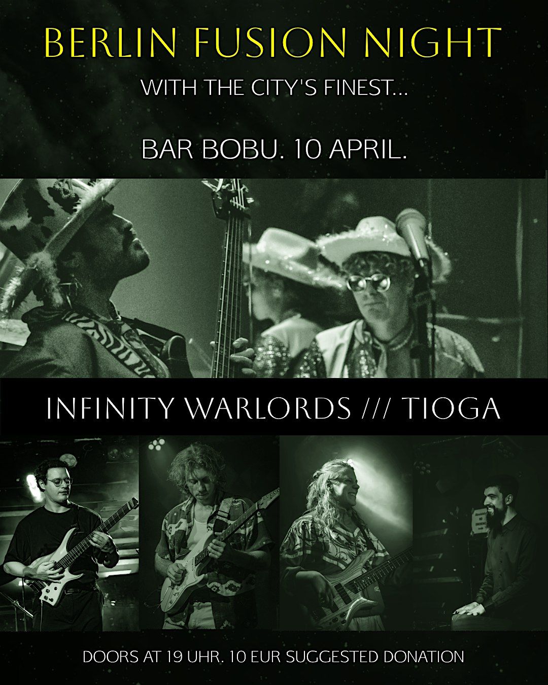 Calling all melomaniacs this APRIL 10th in BAR BOBU to witness two of the most daring and fresh bands to come out of the Berlin fusion scene. TIOGA and INFINITY WARLORDS will serenade audiences with chops, melodies, young energy and infectuous rhythm. It is an invitation to disconnect from your headphones, put aside your phone and revel in what the city has to offer musically. I wouldn't miss it. Would you?