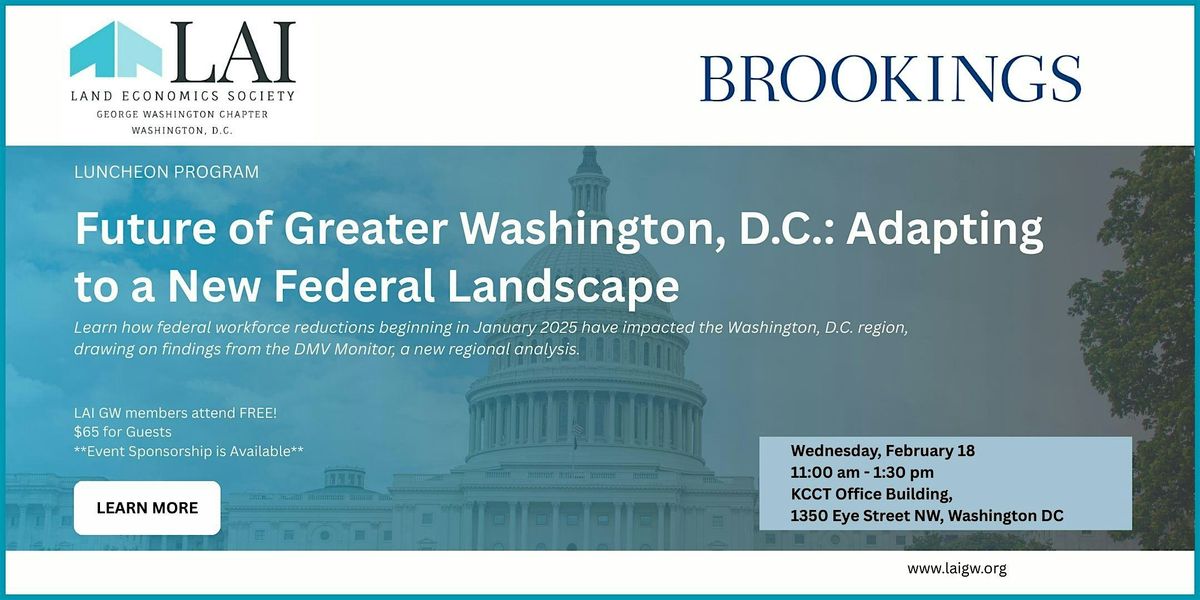 Join the George Washington Chapter of Lambda Alpha International (LAIGW) for an engaging luncheon conversation with Tracy H. Loh, a Fellow at Brookings Metro, as we examine how federal workforce reductions from January 2025 have disproportionately affected the Washington region. Drawing on findings from the DMV Monitor, a new regional analysis, the discussion will explore the economic, real estate, and workforce implications of federal job losses, spending cuts, and office lease terminations across the National Capital Region.