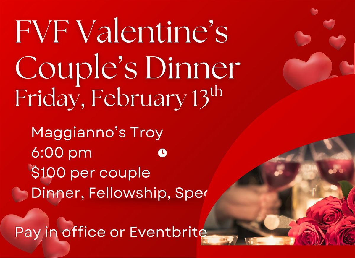 Looking for a cozy night out? Join us in person for the FVF Couples Valentine Dinner! It's the perfect way to celebrate love with your special someone. Enjoy a warm, romantic atmosphere, great company, games, gifts and a night full of sweet memories. Don’t miss out on this intimate evening designed just for our married couples. Come ready to relax, laugh, and make your Valentine’s Day extra special!