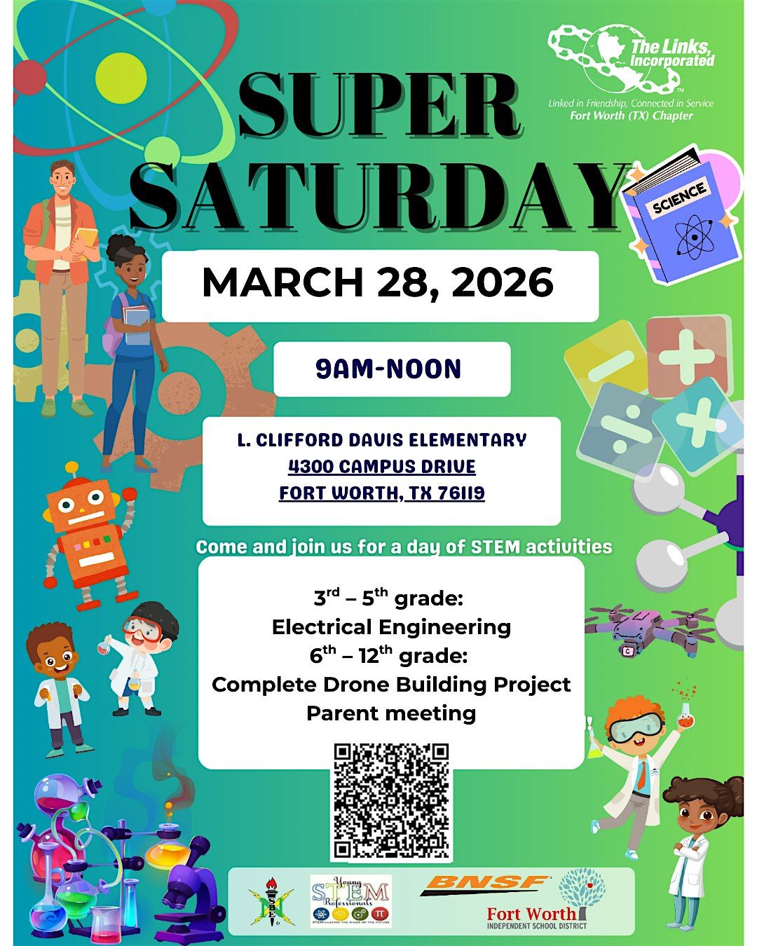 Join the fun as we celebrate science and STEM on Saturday, March 28, 2026! Come enjoy a fun-filled Super Saturday event at Clifford Davis Elementary School in Fort Worth. Get ready for a day of excitement, learning, and hands-on activities for students in grades 3–12 and their parents!