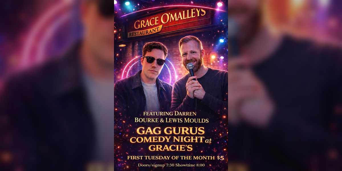 Get ready to laugh your socks off with the Gag Gurus live at Gracie’s! This in-person event brings the funniest folks together for a night packed with hilarious jokes, quick wit, and endless chuckles. Gather your crew and join us for a laid-back evening where good vibes and great comedy take center stage. Don’t miss out on the fun – it’s all happening right here at Gracie’s!