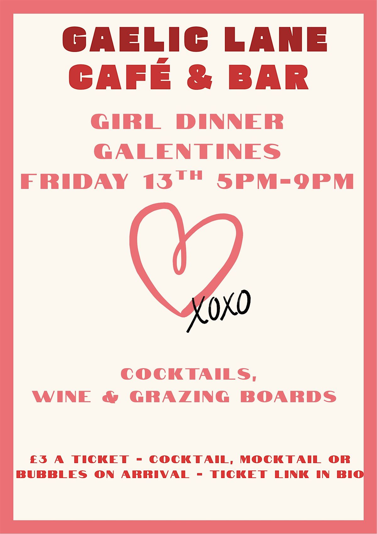 Get ready for a fun in-person night out with your favorite gals! Join us at Gaelic Lane for the Galantines Girl Dinner, a perfect chance to celebrate friendship, laugh a lot, and enjoy some great food together. Bring your besties and make some unforgettable memories in a cozy, welcoming spot.