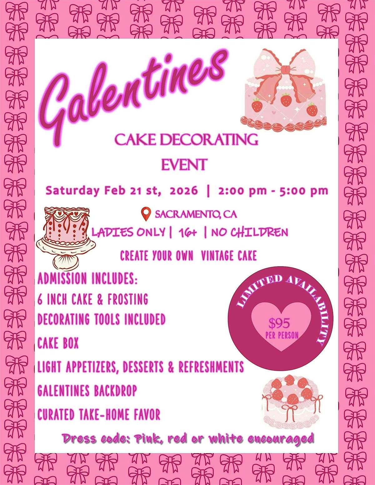 Welcome to the Galentines cake decorating event! Get ready to unleash your creativity and decorate some delicious cakes with your gal pals. Join us on February 21, 2026 at 2:00 PM for a fun-filled afternoon of frosting, sprinkles, and laughter.