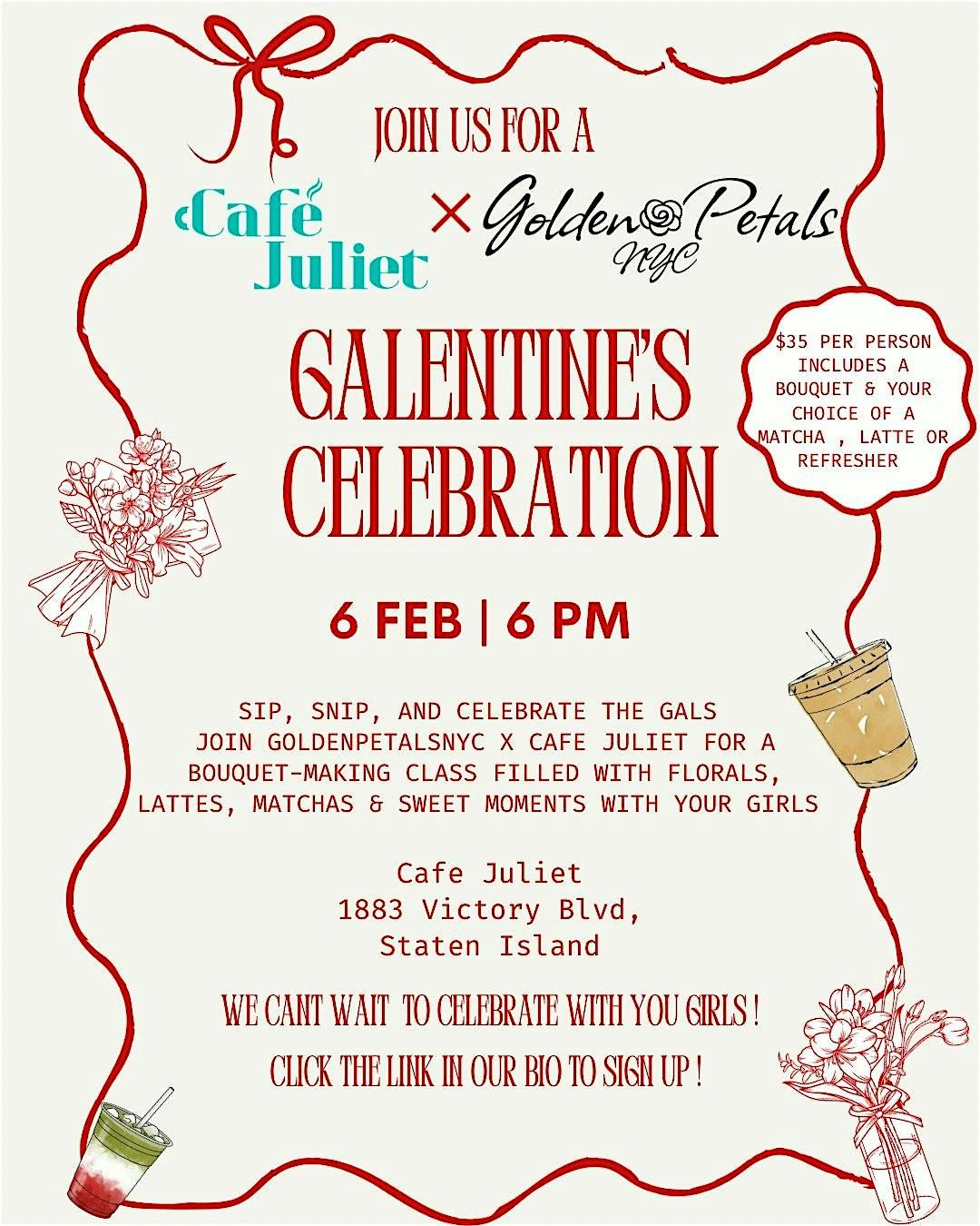 Get ready for a fun-filled in-person gathering all about celebrating friendship and girl power! Join us for an afternoon of laughter, great vibes, and unforgettable memories. Whether you're catching up or making new friends, this is your perfect excuse to indulge in some quality time together. Don't miss out on all the fun and surprises we've got planned just for you! We will be making bouquets and sipping on your favorite drinks from Cafe Juliet which is included in your ticket purchase. As well as going home with a beautiful bouquet !