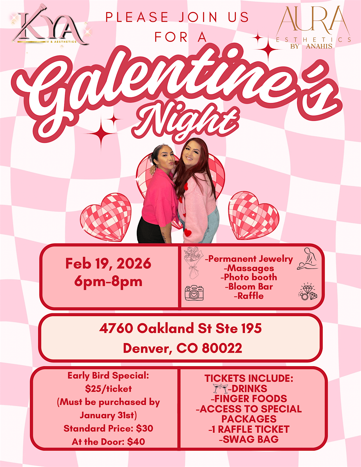 Grab your besties and get ready for a night of beauty, self-care, and fun at our Galentine’s Night hosted by KYA IV & Aesthetics and Aura Esthetics by Anahis. Join us on February 19, 2026 from 6–8 PM for an elevated girls’ night filled with permanent jewelry, relaxing massages, a photo booth, a Bloom Bar to create your own bouquet, raffles, and exclusive beauty and wellness packages available only for attendees. Your ticket includes drinks, finger foods, a swag bag, and a raffle entry, making it the perfect way to treat yourself or celebrate friendship in a fun, luxe atmosphere. Come sip, shop, glow, and connect with us for an unforgettable Galentine’s experience in Denver. 💖