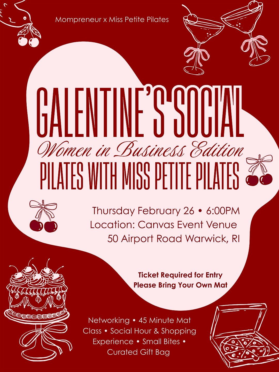 Join us for our Galentine's Social! Networking session, a Pilates mat class hosted by Miss Petite Pilates, and social hour with small bites