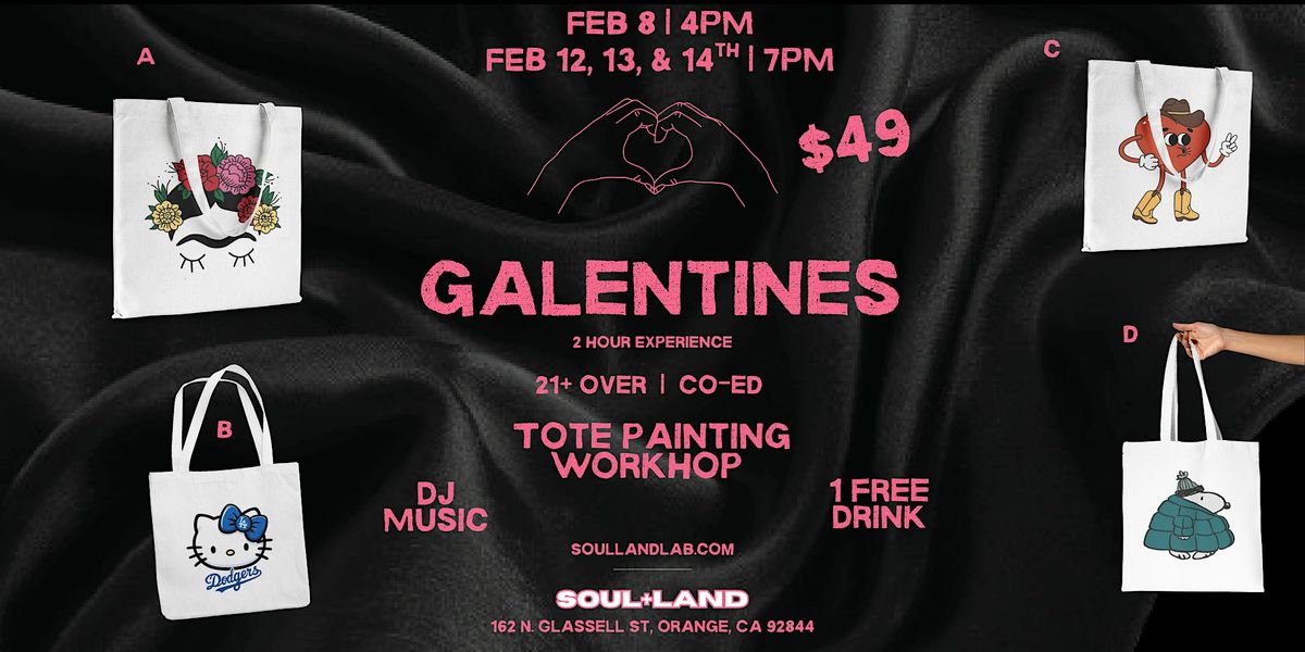 Celebrate friendship with a fun, laid-back Galentine’s Paint Night at Soulland LAB! Join us for a 2-hour, co-ed creative experience filled with good music, great vibes, and drinks. Paint a pre-stenciled tote at your own pace and make it uniquely yours, perfect for besties, couples, and your favorite plus-ones.