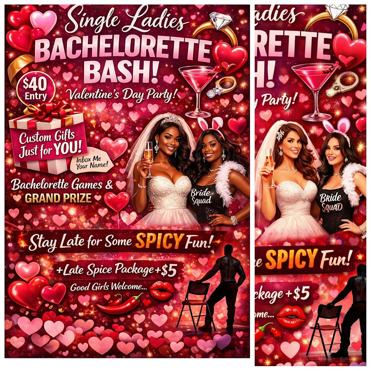 Calling all unmarried women—this one’s for YOU! This Valentine’s Day, we’re turning love day into a celebration of friendship, fun, and full-on bachelorette energy. Whether you’re single, dating, or just here for the vibes, this night is all about enjoying life with your girls.🎁 Custom Gifts Just for YouYour $40 entry fee includes a custom bachelorette gift made especially for you! After you’ve paid, text your name for personalized your gift—no name, no custom 🫣 surprise must be submitted by Feb 7th😉🎉 Games, Games & More GamesGet ready for all your favorite bachelorette games, nonstop laughs, and a little friendly competition. We’ll be playing to win a grand prize, so bring your A-game!👗 Dress to Impress: Bachelorette EditionCome dressed as a bachelorette—however you interpret it! Sexy, classy, fun, bridal-core, wild, or creative… there are no rules. We’ll be voting for Best Dressed, so show out!This night is about celebrating single women, sisterhood, confidence, and FUN. Grab your spot, send your name for your custom gift, and get ready for an unforgettable Valentine’s Day bash 💕🥂S.N. 💋For my good girls who like it a lil wild, feel free to stay a little later…Our demure ladies may head home early before a very special spicy guest makes an appearance 👀🔥✨ Late Spice Package: +$5That’s it. That’s the tea.You choose your vibe—sweet or spicy—but just know the night gets a little extra after hours
