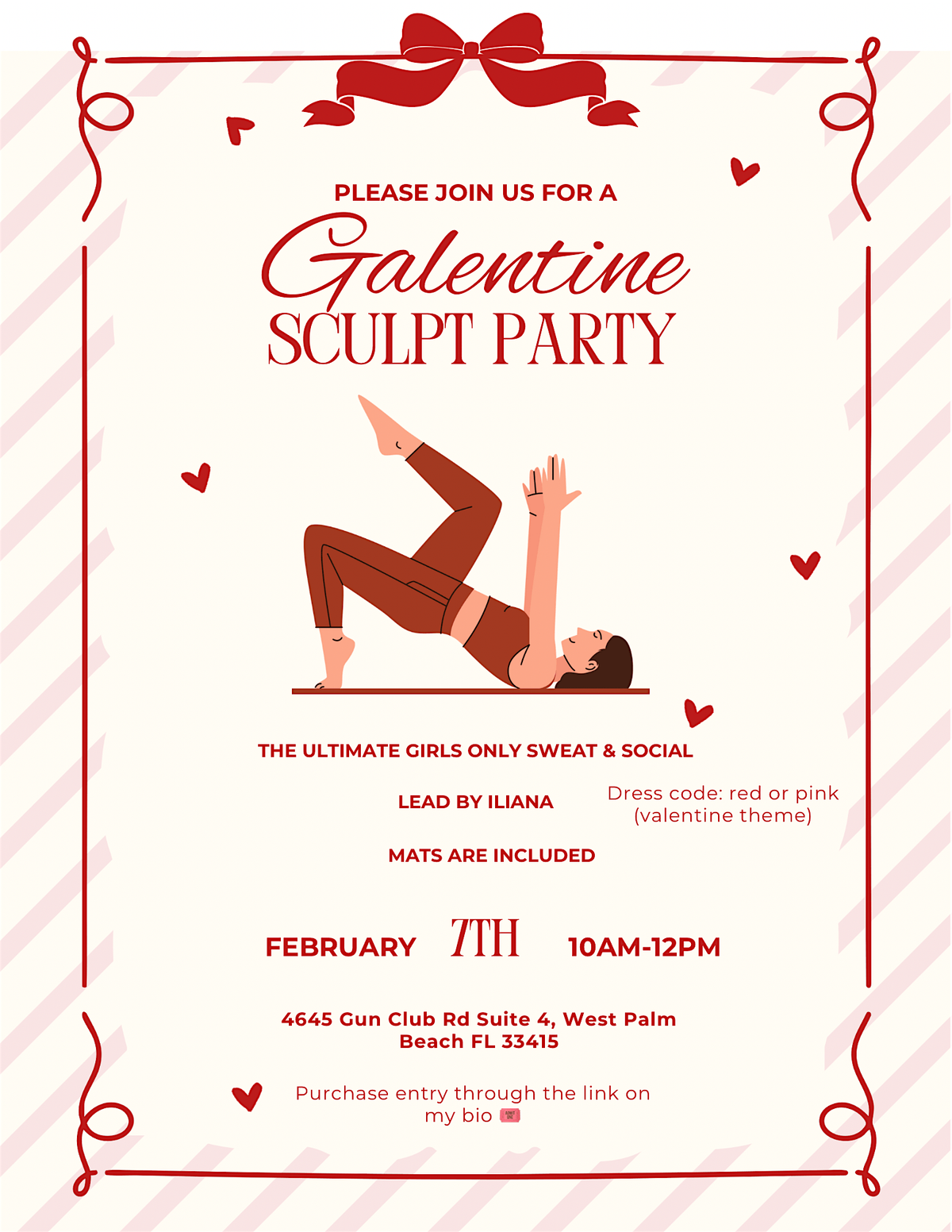 We’ll move together in a 45-minute Pilates-inspired mat sculpt — class led by Iliana — then stay after to play games, do Galentine’s activities, and connect with amazing women ✨