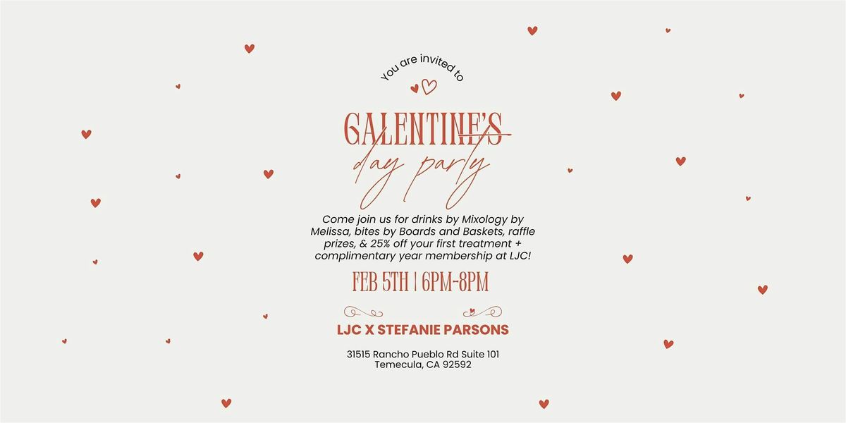 Join us for a fun-filled evening celebrating Galentine’s Day! Enjoy handcrafted drinks from Mixology by Melissa, delicious bites from Boards and Baskets, 25% off your first LJC treatment when you book* that day, a complimentary year membership (valued at $140) just for attending, free personalized skin analyses (valued at $150), and luxurious raffle prizes throughout the night.