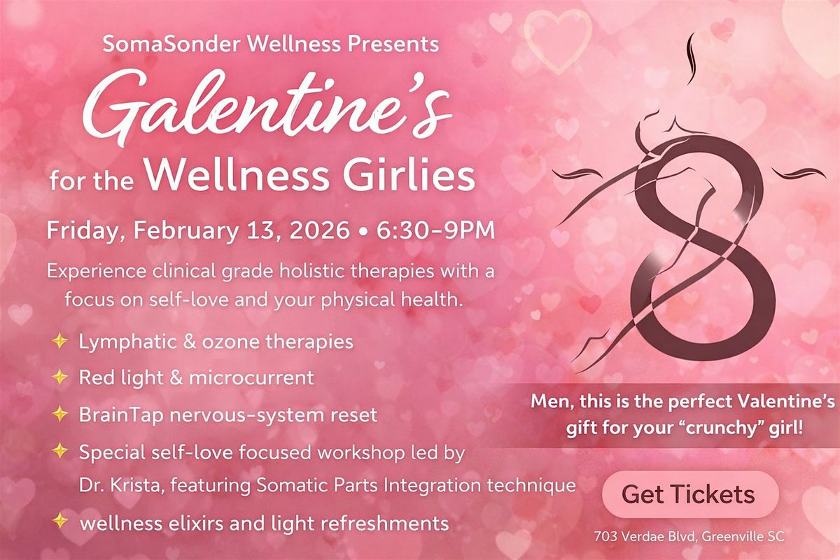 Join us Friday, February 13, 2026 at 6:30-9pm for a special Galentine's event, dedicated to the wellness girlies in Greenville—experience the clinical grade holistic therapies we have to offer at SomaSonder, with a special focus around the theme of cultivating self love, and what it truly has to do with your physical health. Men, this is the perfect valentine's gift for your "crunchy" girl!