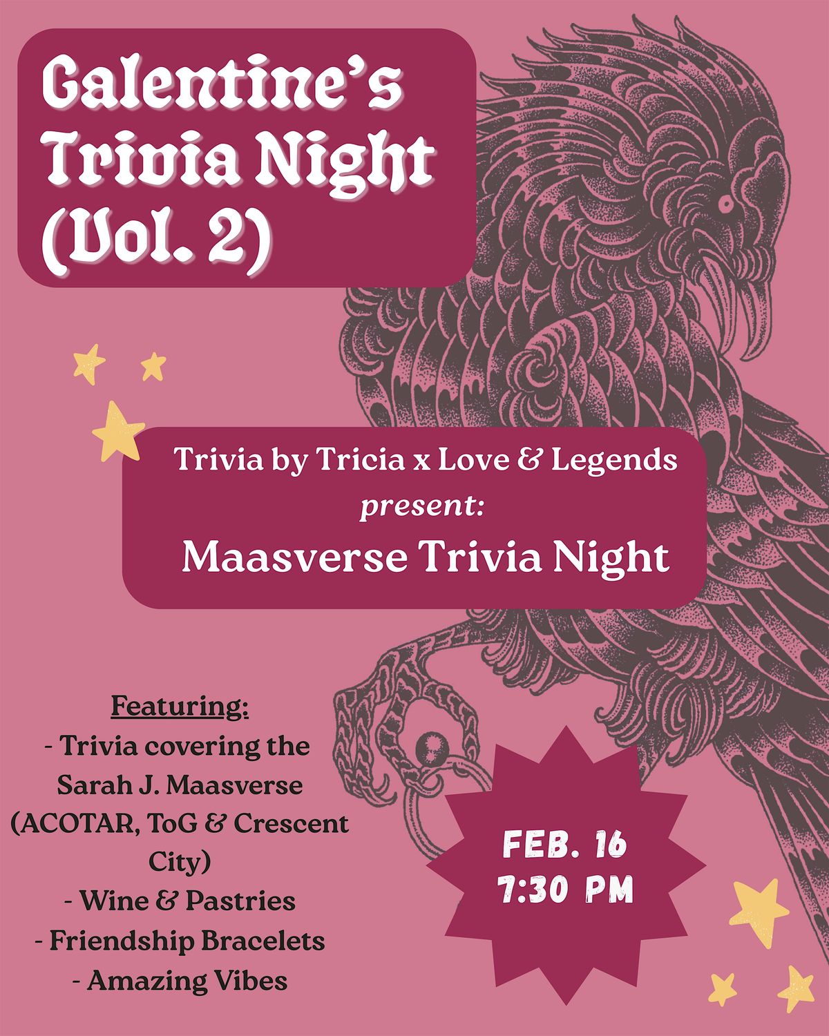 Join us for a Galentine's celebration as we play trivia on the Sarah J Maasverse (ACOTAR, ToG & Crescent City), led by Trivia by Tricia.