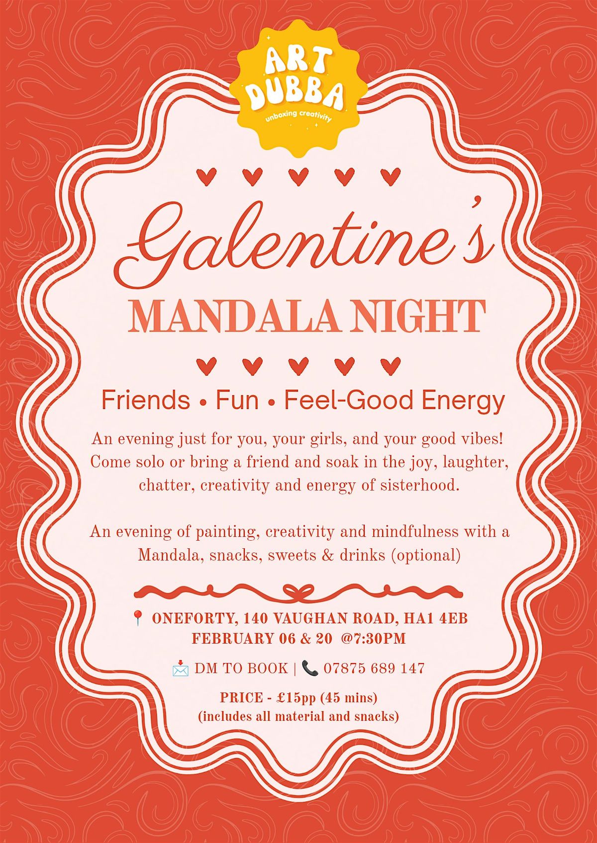 Hey ladies! Join us for a fun and relaxing evening at our GALENTINES Mandala Night. Get creative as you dive into the world of mandala art, surrounded by good vibes and even better company. This is an in-person gathering — the perfect chance to unwind, chat, and make some beautiful designs with your gal pals. Don’t miss out on a night full of colors, laughter, and friendship!