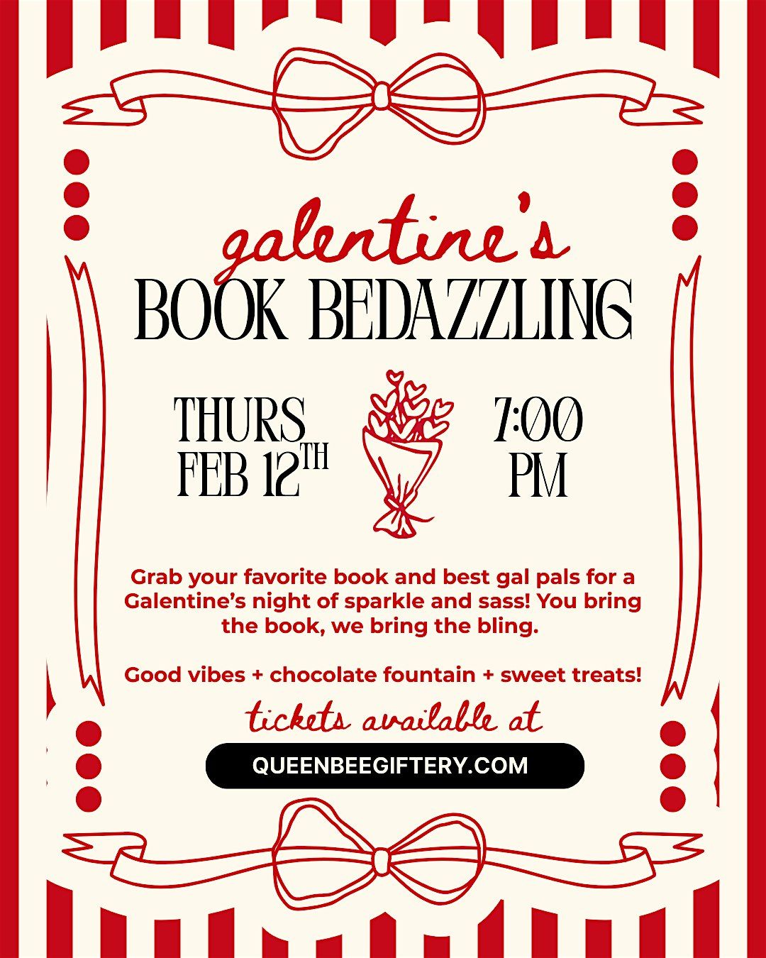 Grab your besties for a fun in-person evening filled with book bedazzling creativity and a luscious chocolate fountain to satisfy your sweet tooth. It's all about celebrating friendship, crafts, and delicious treats—because girls just wanna have fun! Don't miss out on this glam and tasty night!