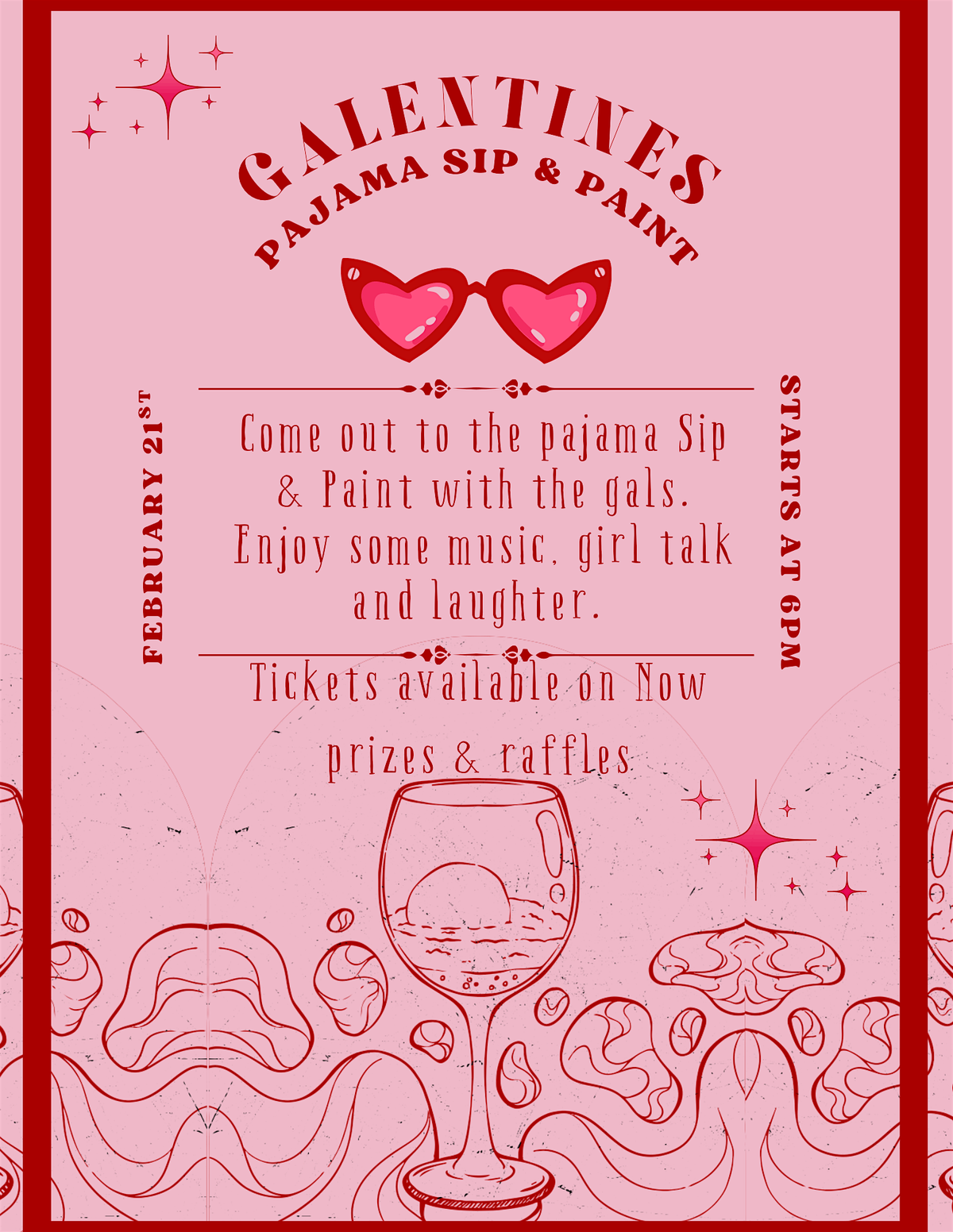 Come out and enjoy a Galentines Pajama Sip and Paint. Wine light refreshments, games, door prizes and more.