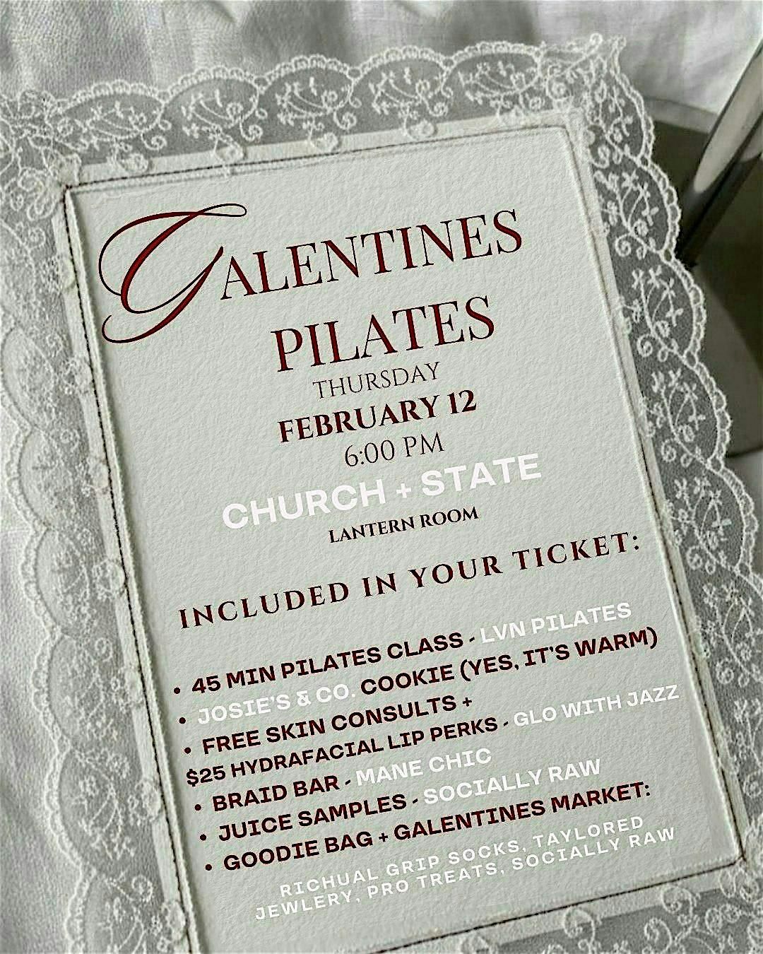 Show yourself some love! Join us for Galentines Pilates, Thursday February 12th at 6pm at Church + State, Lantern Room 💌