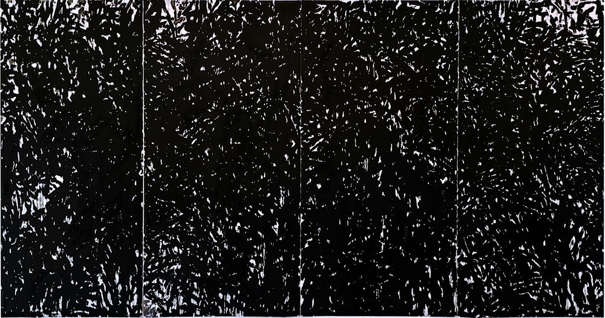 Image: Sandy Walker, Green Mansions, 1993. Aqaba, fir plywood, 96 x 48 inches (each of 4), overall 96 x 192 inches. Printed on press by Joan Hall assisted by Romi Sloboda at 20th Street Studios, St. Louis Missouri. Printed at Island Press in Peter Marcus's studios, St. Louis, Missouri. Edition of 10. Courtesy of the artist