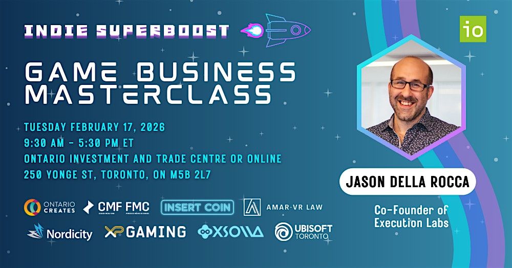 Interactive Ontario's Indie Superboost Game Business Masterclass is a hybrid day-long masterclass led by industry veteran, Jason Della Rocca, held in Toronto at the Ontario Investment & Trade Center on February 17, 2026.