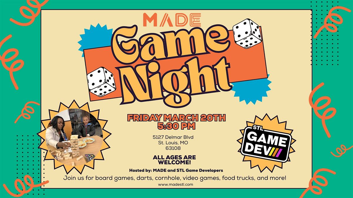Game Night at MADE! Join us for board games, food trucks, video games, and the grand opening of our new artisan maker's mall: The Front Room