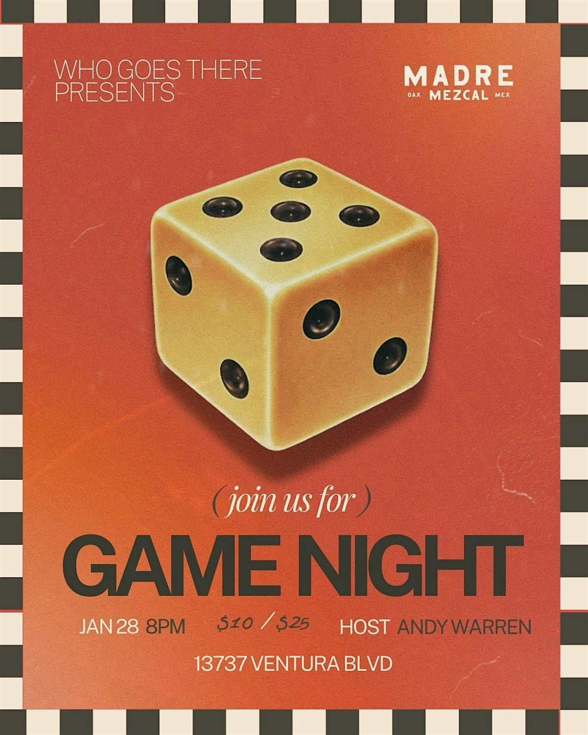 Join us for a fun, competitive night of games, connection, and friendly rivalry. Meet new people, challenge opponents, and play your favorite games. Two ticket options available, entry only or open bar. Open bar by Madre Mezcal from 8–10pm. Feel free to bring your own games.