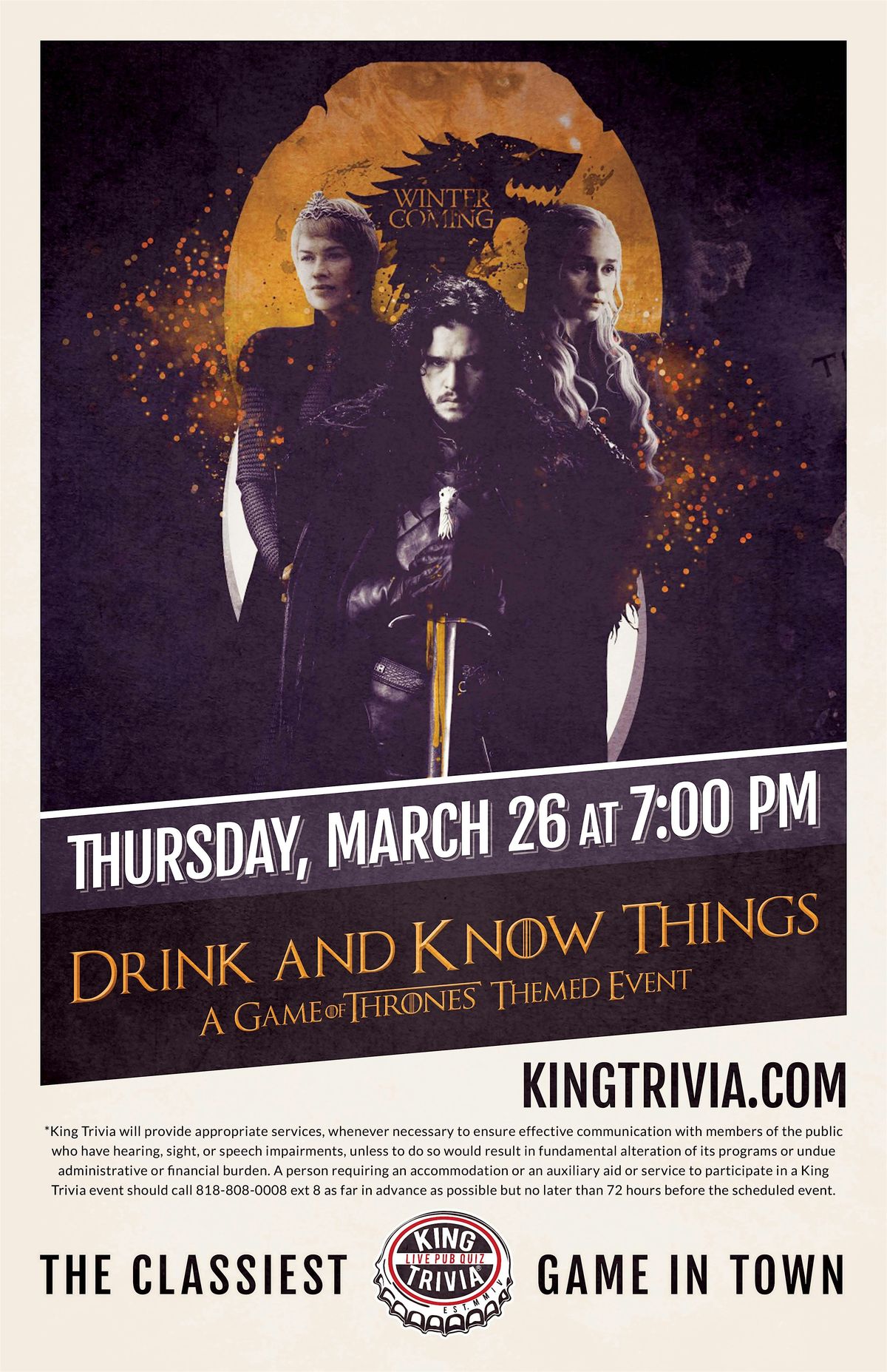 Put your knowledge of Westeros to the test in this fun, in-person trivia night. Whether you're a fierce House Stark fan or a cunning House Lannister loyalist, come show off your smarts and enjoy some great vibes. Gather your crew, grab a drink, and get ready for an epic night of Game of Thrones trivia action!