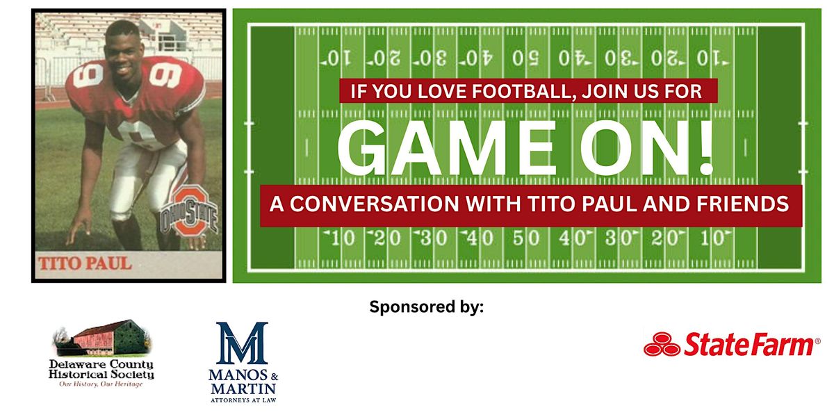 As a fundraiser, on January 14, 2026, The Delaware County Historical Society is presenting “Game On” for fans of OSU football and the National Football League. Tito Paul, Delaware city businessman, OSU football player and NFL Super Bowl winner is bringing along 4 or 5 of his OSU and NFL football friends to talk about football. It will be an evening of OSU football stories, NFL experiences from the Denver Broncos, Cincinnati Bengals, Tampa Bay Buccaneers, Tennessee Titans, and a real-life account of what it means to play in and win a Super Bowl. A Q&A period will follow the discussion. Invited football players include:
