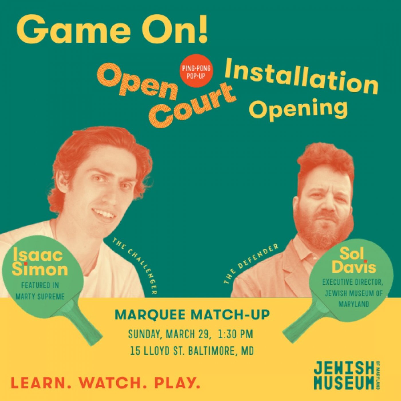 Join the Jewish Museum of Maryland for the opening of Open Court: Ping-Pong Pop-Up, an experiential pop-up installation transforming the Museum’s Cohen Weinberg Gallery into a community ping-pong venue featuring three tables, scoreboards, spectator bleachers, a vibrant super graphic wall treatment, and customized ping-pong balls.