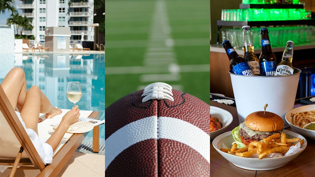 Catch every play poolside on two large outdoor screens, with game-day favorites and drinks served from the Pool Bar. Full-day pool access or game-only entry available — valet parking included.