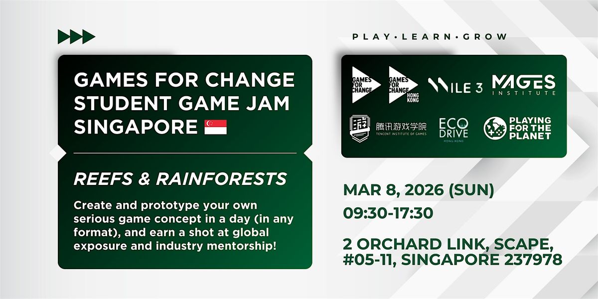 The Games for Change Singapore Game Jam 2026 invites secondary school and university students to spend one full day designing and building games that tackle real-world environmental challenges — through creativity, collaboration, and play.