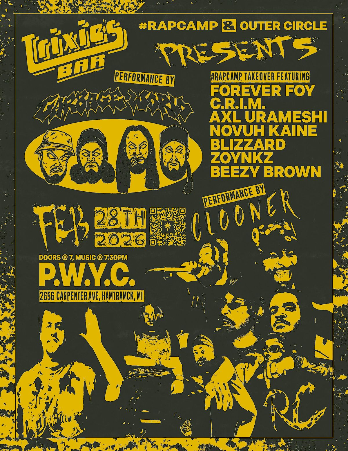 A Southeast Michigan artist showcase featuring performances by Garbage World, #RAPCAMP & Clooner. Pay what you can ($5 - $10 recommended)