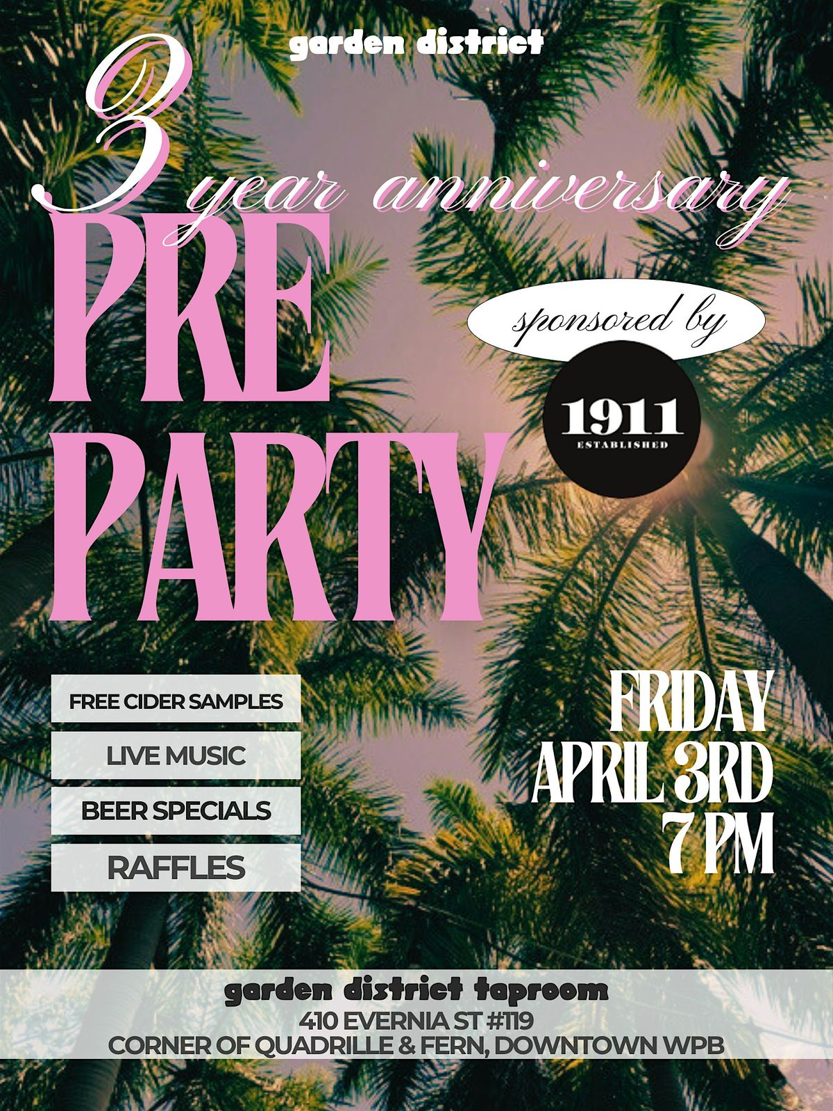 Come hang for our anniversary pre-party! We'll have free cider samples, live music, games and more! Sponsored by 1911 Established Distillery.