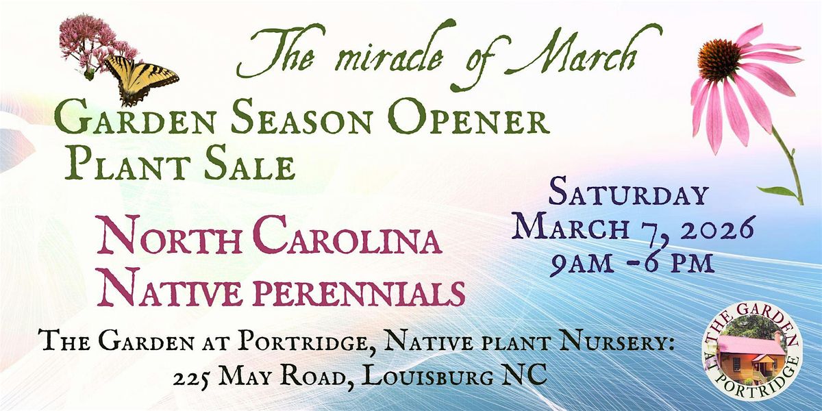 Join us and other serious North Carolina Perennial plant enthusiasts for our Garden Season Opener Plant Sale on Saturday, March 7, 2026, from 9 am to 6 pm at The Garden at Portridge, Native Plant Nursery, 225 May Road, Louisburg, NC.