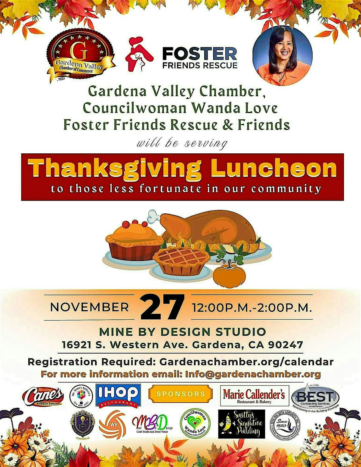 Gardena Valley Chamber, Councilwoman Wanda Love, Foster Friends Rescue & Friends will be serving a community Thanksgiving LuncheonAbout this Event