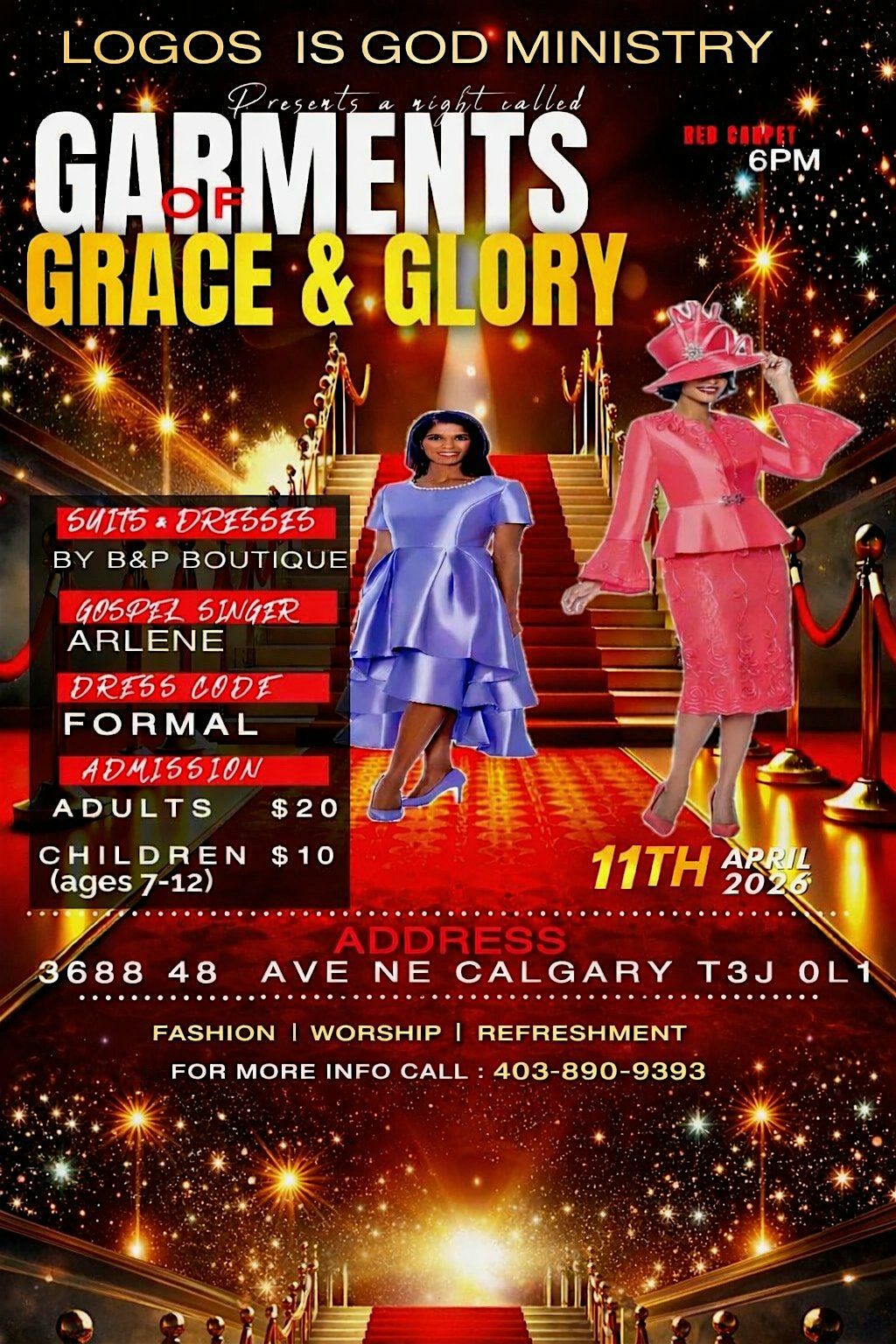 Garments of Grace & Glory ✨ April 11, 2026 | 6 PM Calgary. Fashion, Worship & Refreshments. Adults $20 | Kids 7–12 $10.