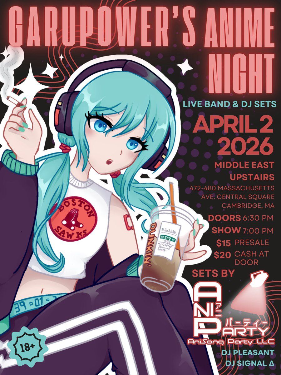✨ Experience the magic of GaruPower's Anime Night, where moments become memories that last a lifetime! 🏛️ The iconic Middle East - Upstairs in Cambridge, MA sets the perfect stage for an unforgettable celebration on April 1st, 2026 at 07:00 PM. 🌟 It's been a curated experience that brings together the best of entertainment and innovation, creating an atmosphere of wonder and excitement. From the moment you arrive, you'll be immersed in a world where the ordinary transforms into the extraordinary. 🎊 Book early to secure your place in what promises to be an event that will be talked about for years to come!http://maps.seatics.com/GeneralAdmissionEvent_2018-10-03_1713_SVGC_tn.gif