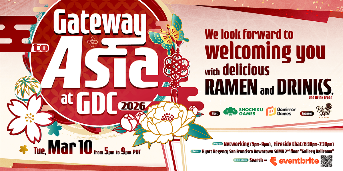 Presented by Asian video game publishers Gamirror Games and Shochiku Games, this is the only offline networking event at GDC focused on the Asian market. Additionally, this event is sponsored by Top Hat Studios.