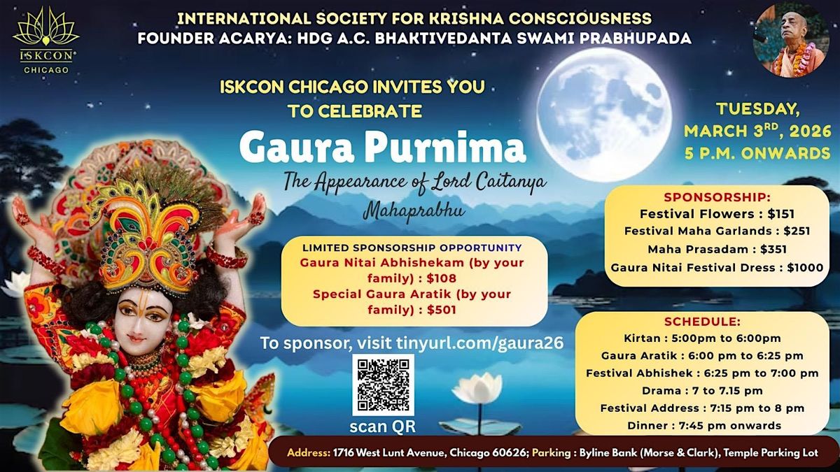 Get ready for an unforgettable in-person gathering filled with joy, devotion, and vibrant festivities. Celebrate the appearance day of Lord Chaitanya with us through lively kirtans, delicious prasadam, and heartwarming community vibes. Bring your friends and family, and experience the spirit of Gaura Purnima like never before. Let's make this day special together!